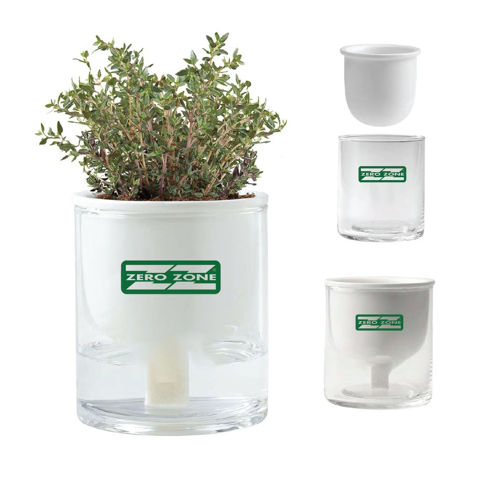 Each planter set includes a ceramic planter, a glass water reservoir, 2 hydroponic wicks, a mixed herb seed packet, and two coconut coir pellets packaged in an informative brown kraft box.